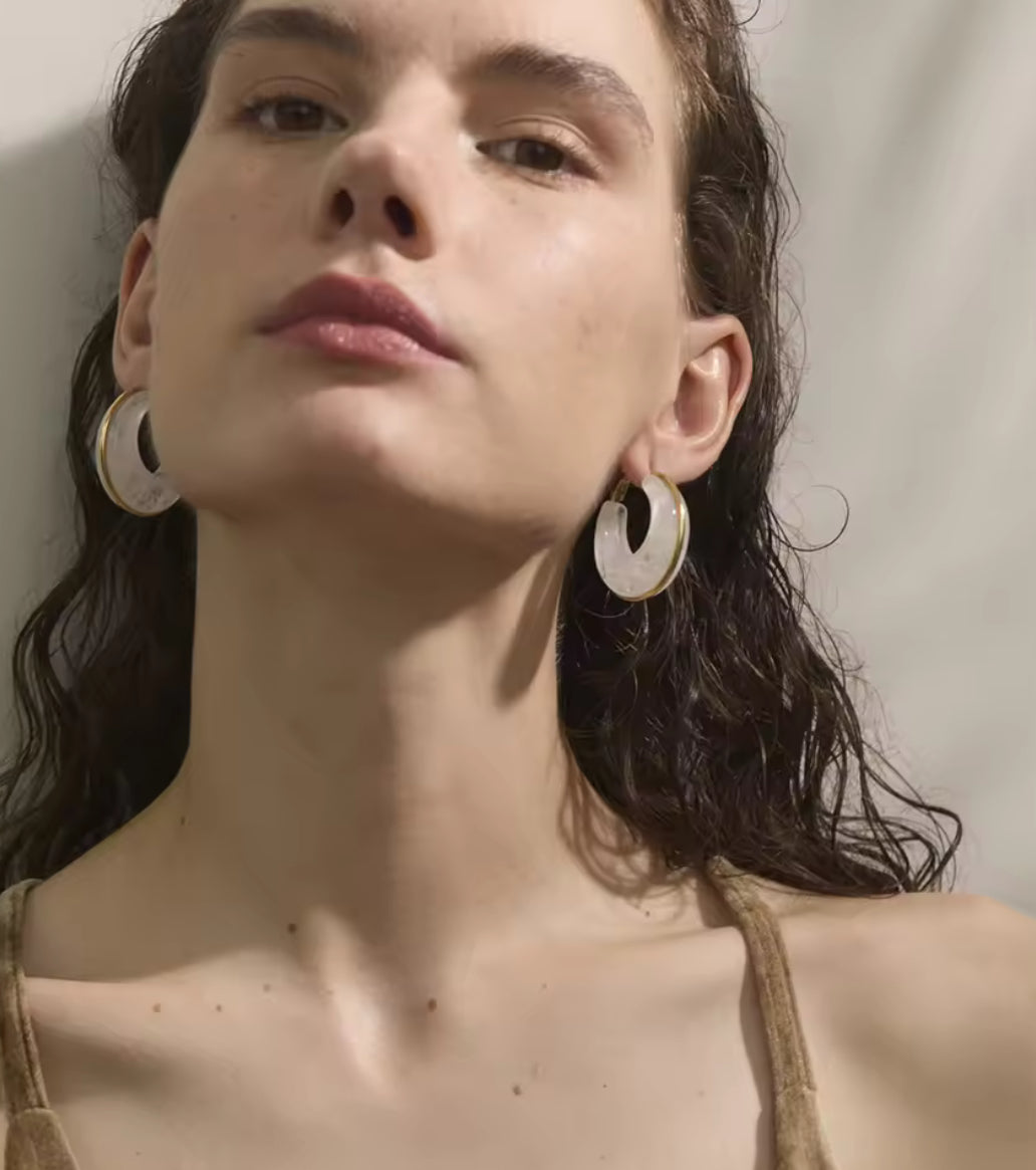 Bold and vibrant chunky hoop earrings made of acetate acrylic and stainless steel. Available in emerald green, amber brown, crystal clear, rose pink, midnight black, and tortoiseshell amber. Lightweight yet striking, perfect for daily wear or styling up your boho-chic outfit.