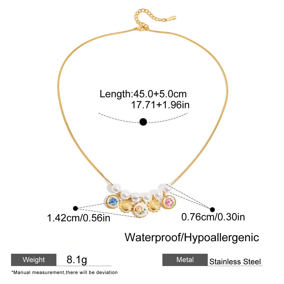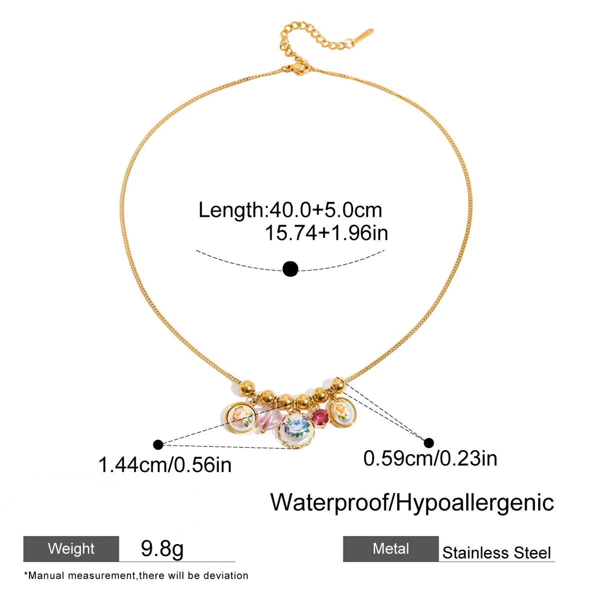 Charms: Hand-painted floral medallions, accented with luminous faux pearls and golden beads, designed to mimic old-world gypsy amulets.