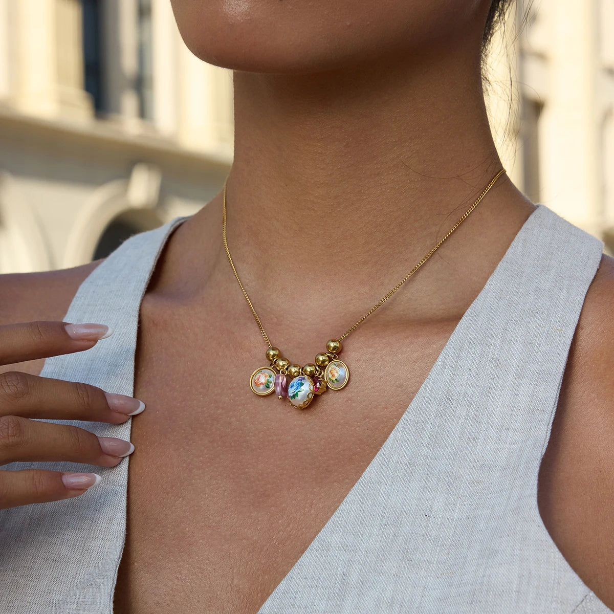 Bloom Petite (9.8g, 40cm+5cm) → shorter style with whimsical floral medallions and dainty beads.