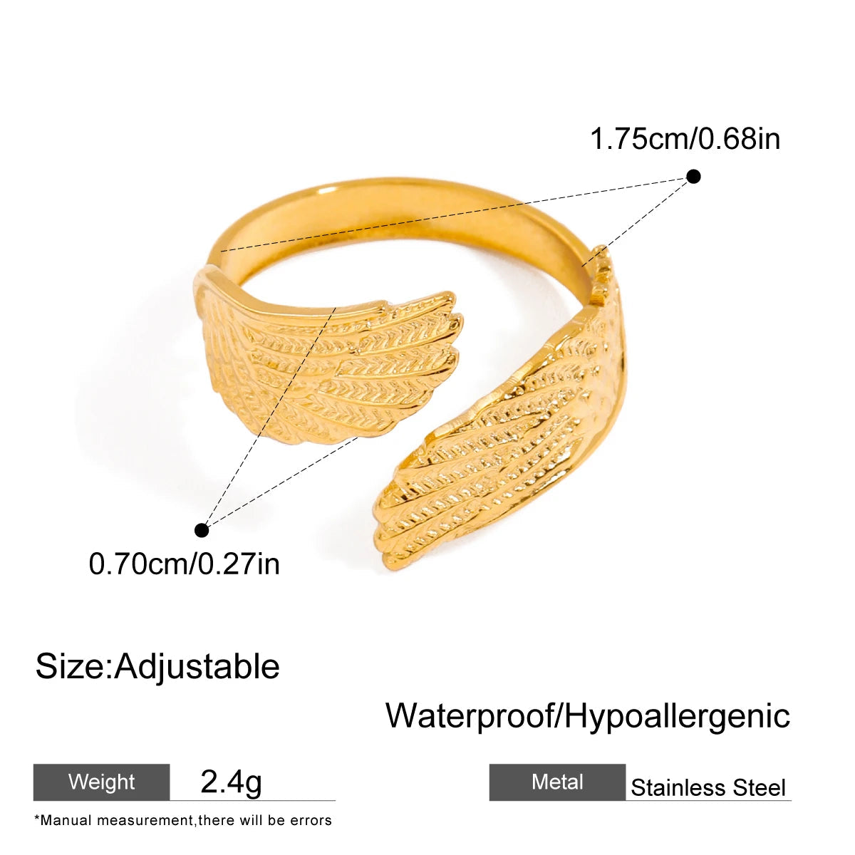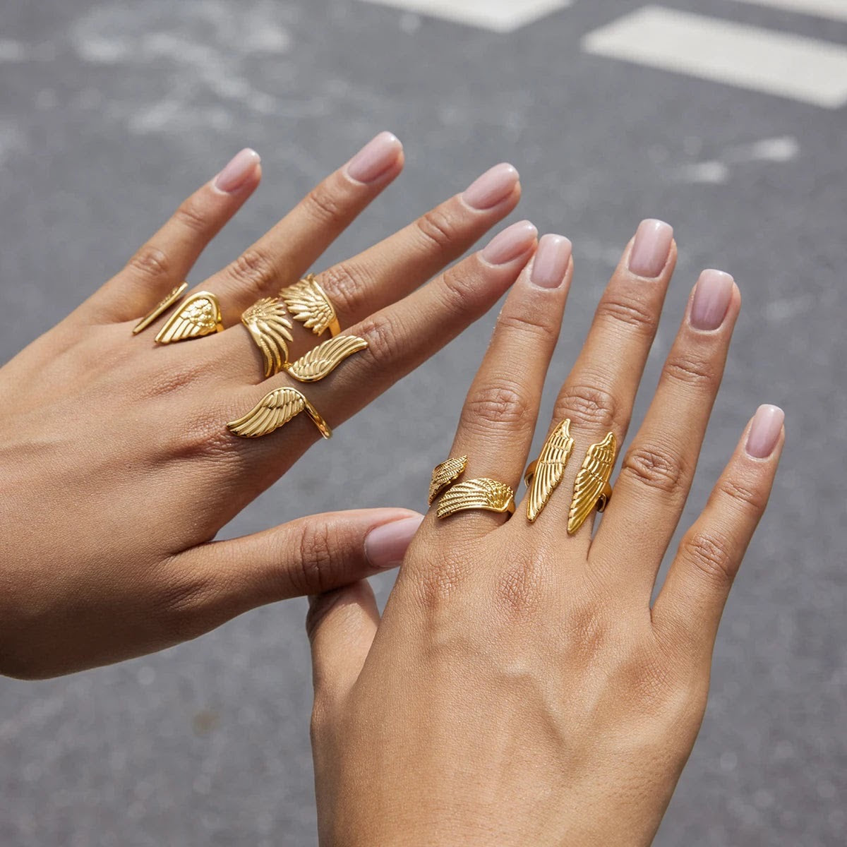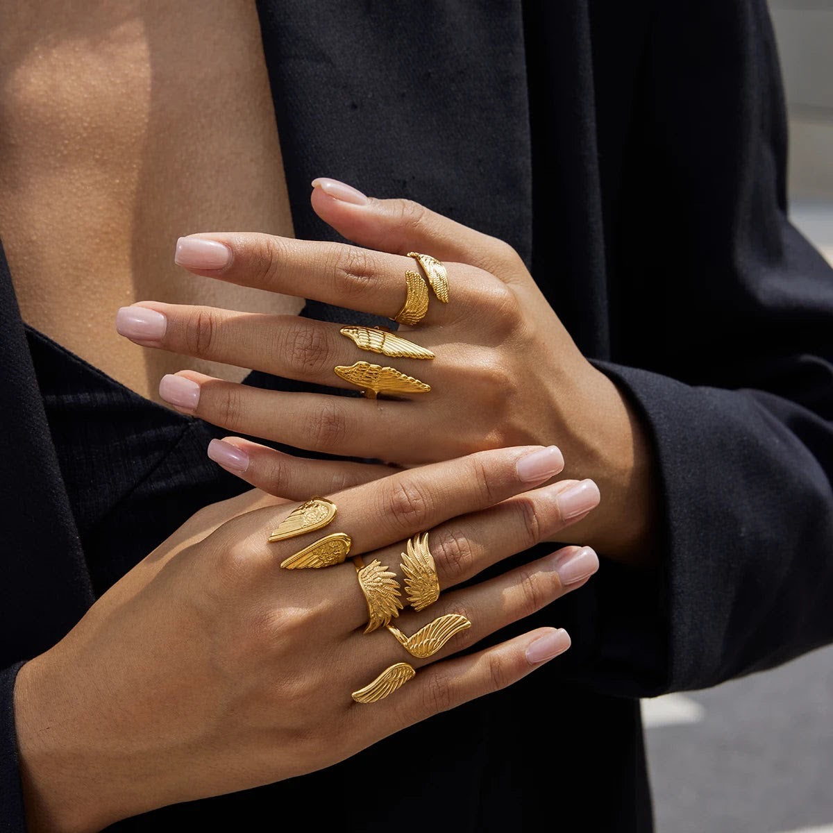 The Celestia Wings Rings embody freedom, strength, and divine elegance. Featuring sculpted wing designs in polished gold-tone stainless steel, this collection represents both grace and power. Adjustable for a perfect fit, each ring is a statement of individuality—whether stacked together for a bold look or worn solo as a symbol of your inner spirit.