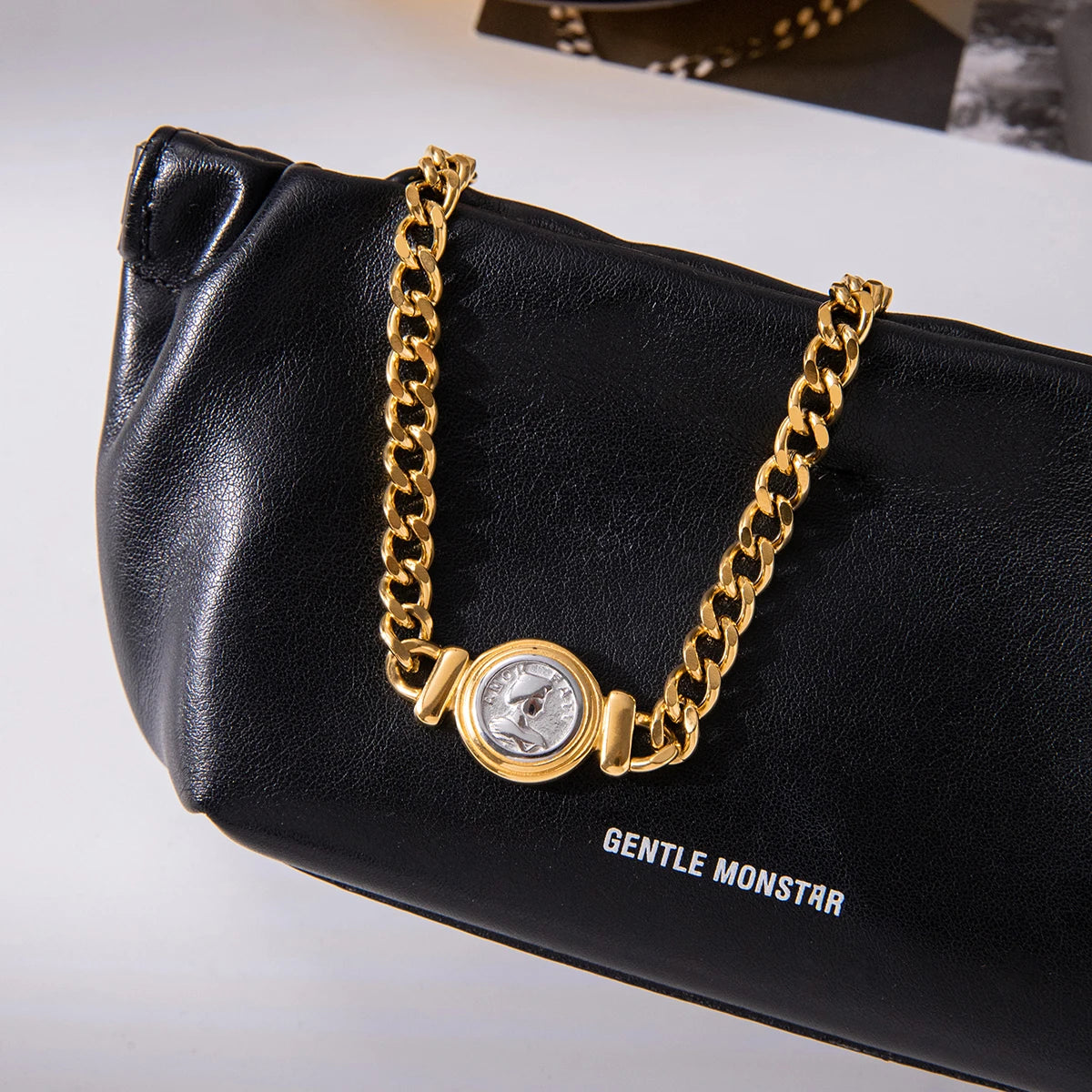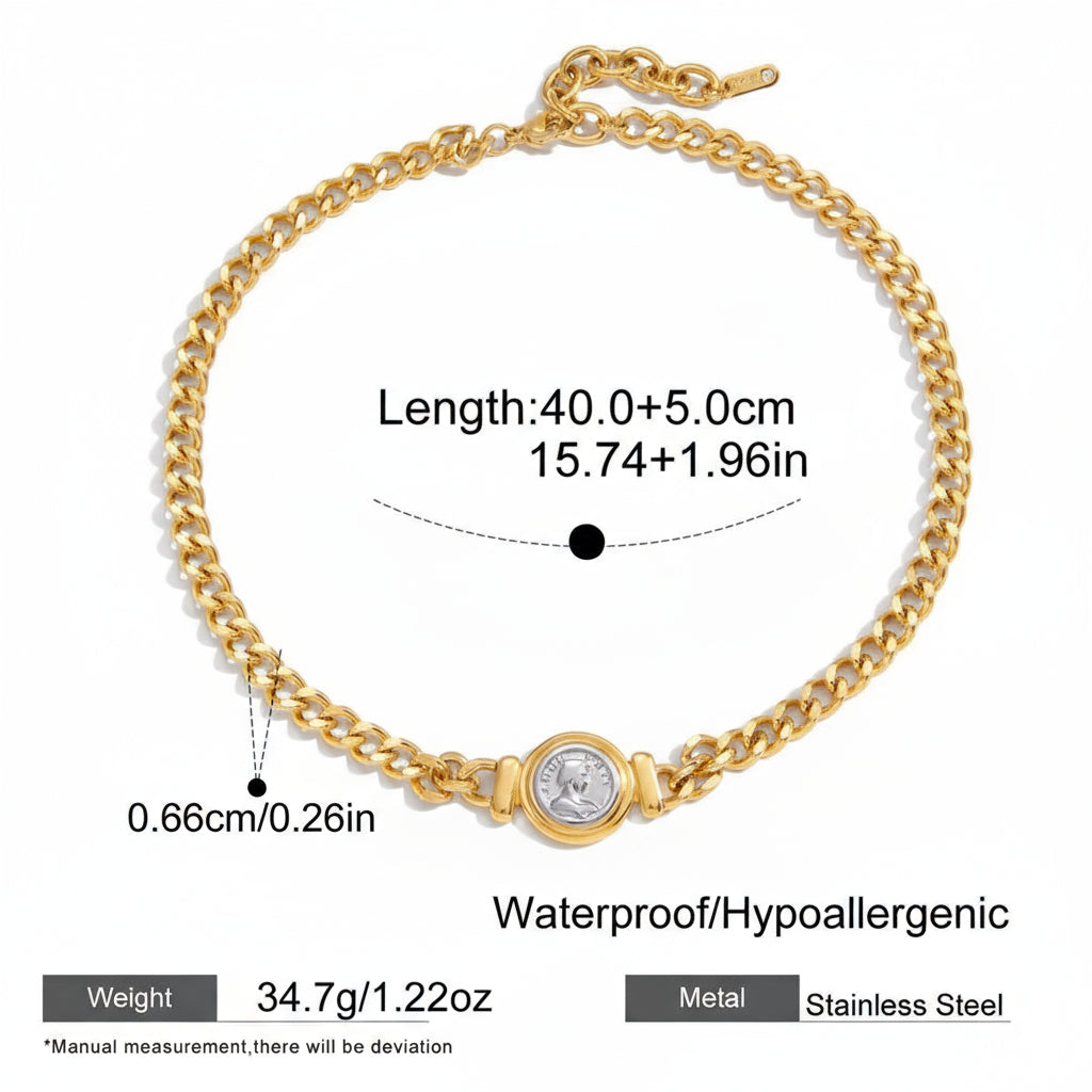 The Gilded Medallion Chain is a bold fusion of vintage charm and modern boho elegance. Crafted from hypoallergenic stainless steel with a rich 18K PVD gold plating, this statement necklace centers on a silver-tone coin medallion, framed in gold for a striking contrast.