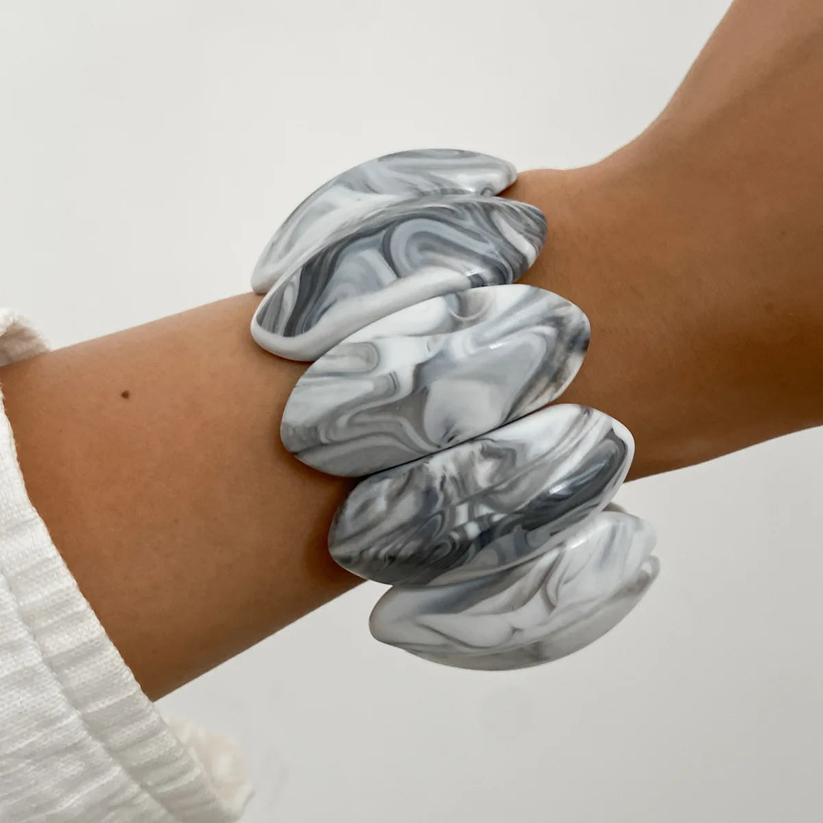 Moonstone Petal Bangle – Layers of marbled gray resin shaped like moon petals, reflecting lunar softness with grounding strength.