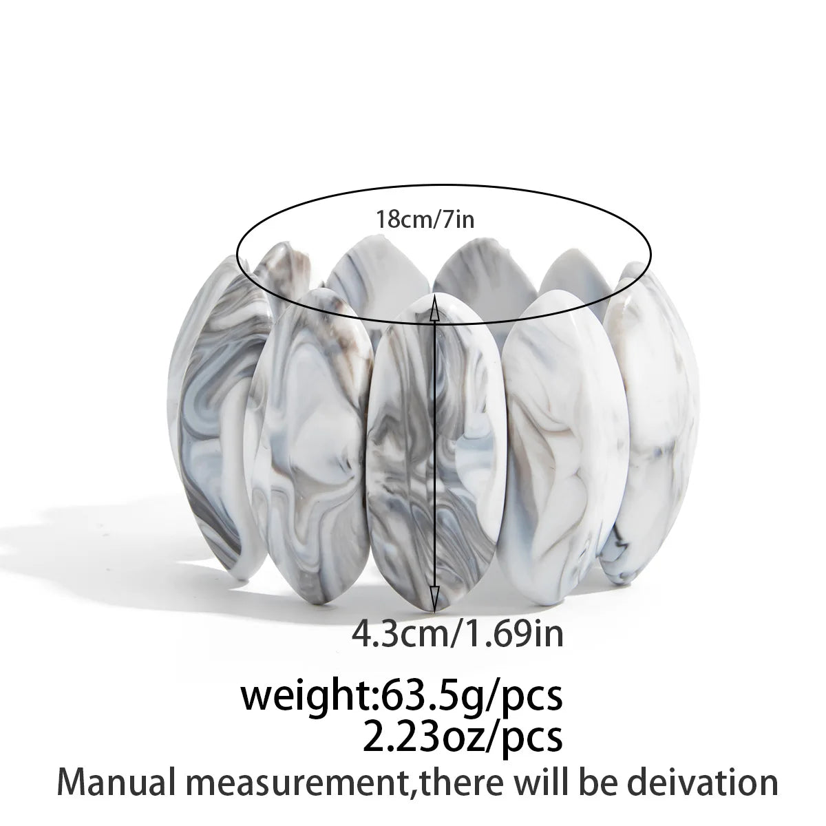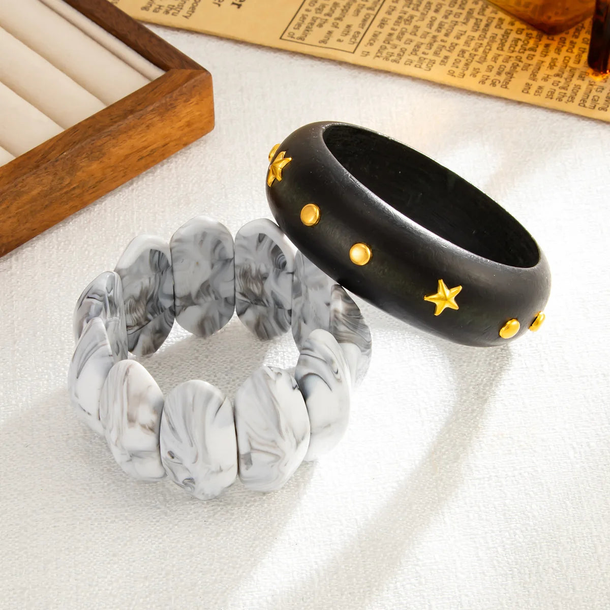 Style Tip: Wear them together for bold contrast, or let the marbled bangle shine on its own with flowy whites and linens. The starry black piece pairs beautifully with metallic accessories or leather for a more rock-boho edge.