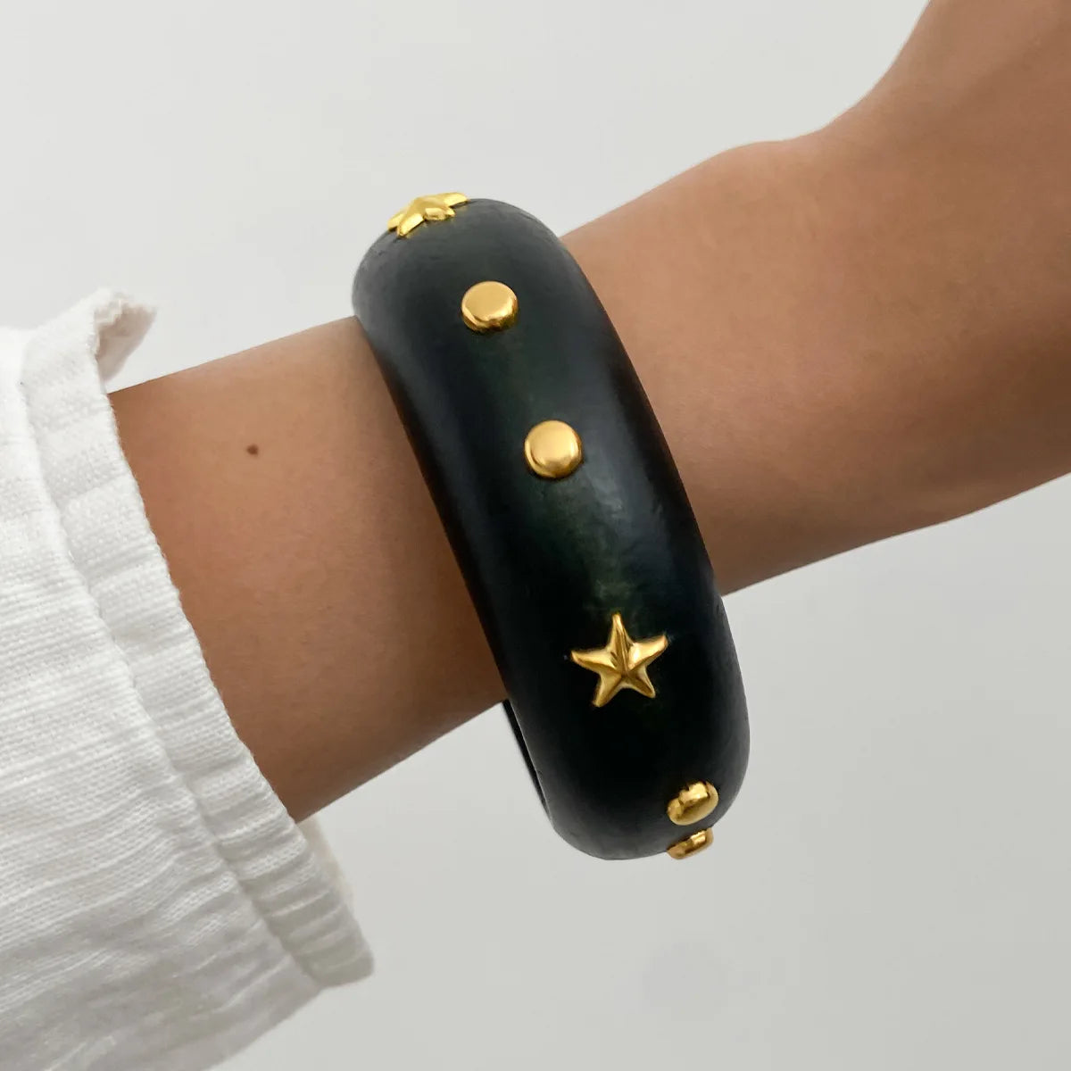 Starlit Night Bangle – Deep black base accented with golden studs and a star charm, reminiscent of constellations guiding free spirits through endless nights.