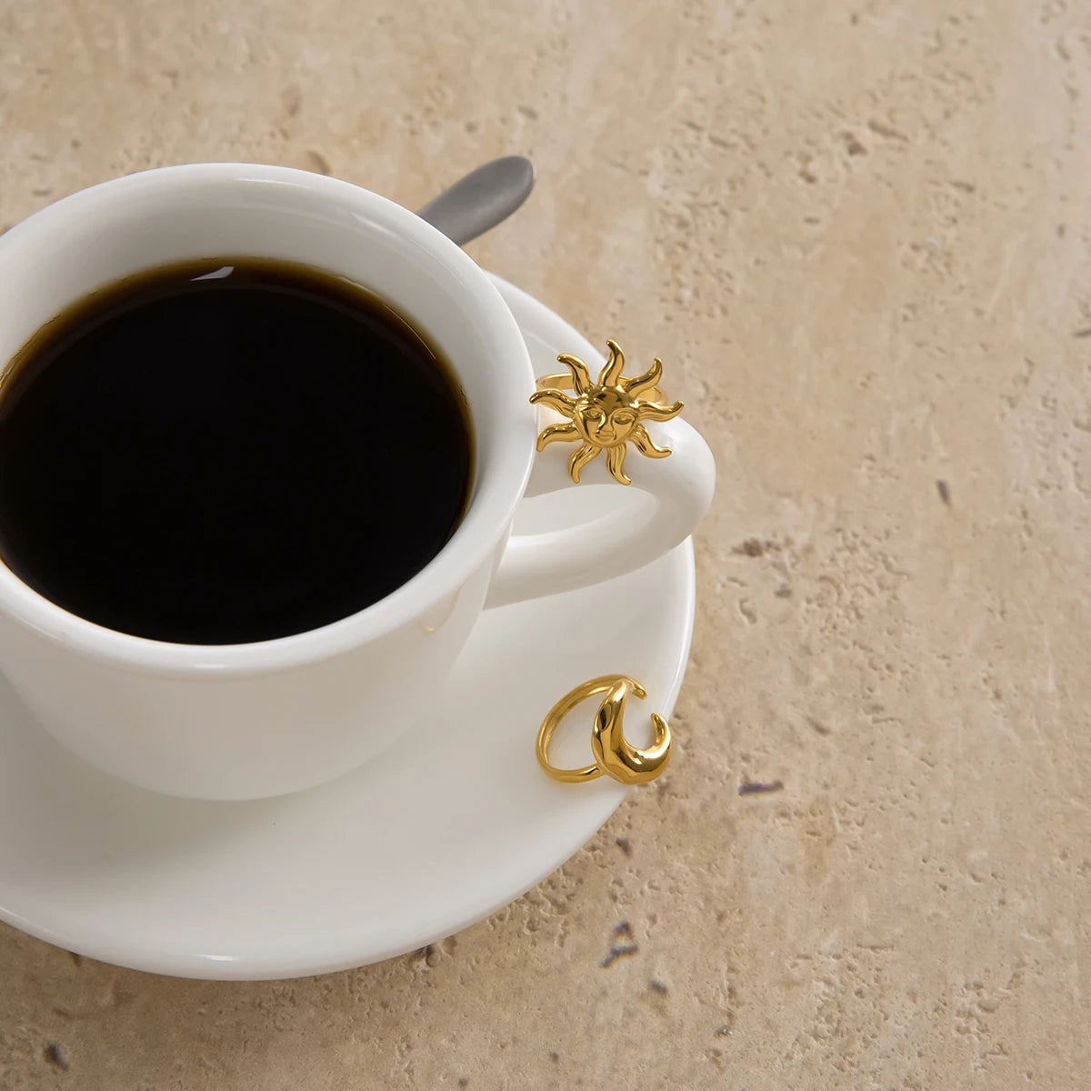 The Soluna Harmony Rings symbolize the eternal dance between the sun and the moon—light and shadow, day and night. Crafted in polished gold-tone stainless steel, the radiant sun ring and crescent moon ring are powerful statement pieces that embody balance, strength, and cosmic beauty. Adjustable and bold, they’re perfect for the free spirit who loves jewelry with meaning.